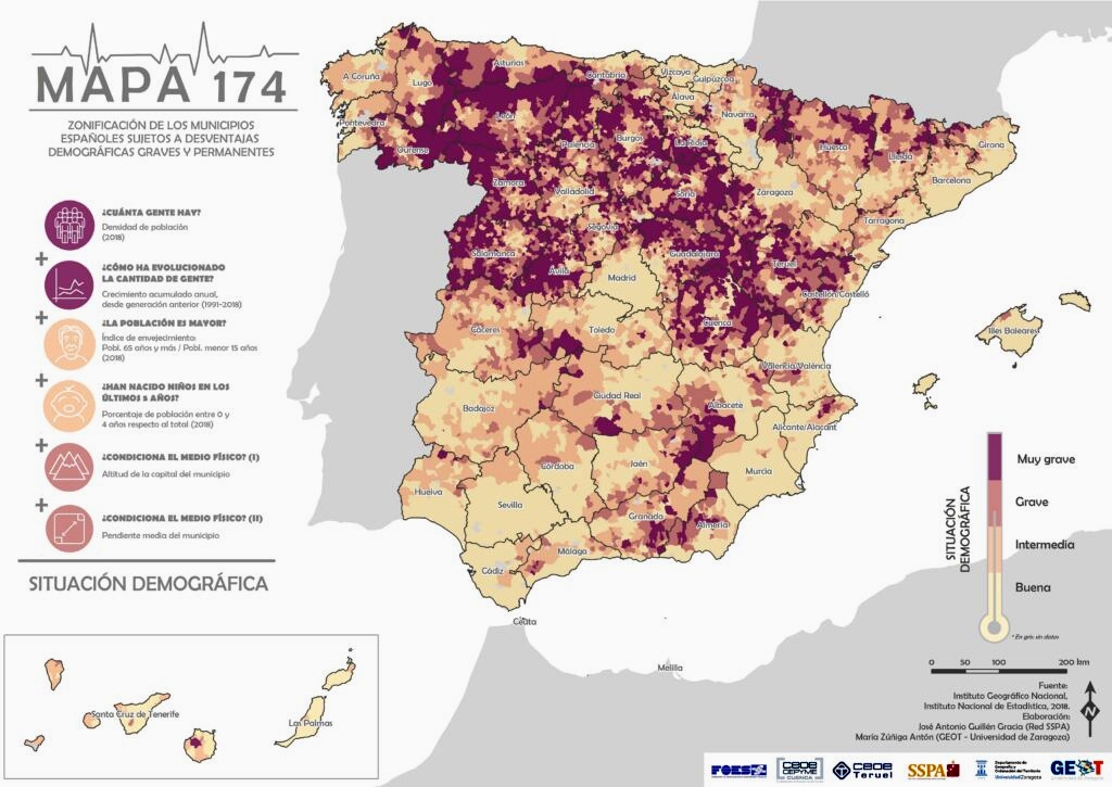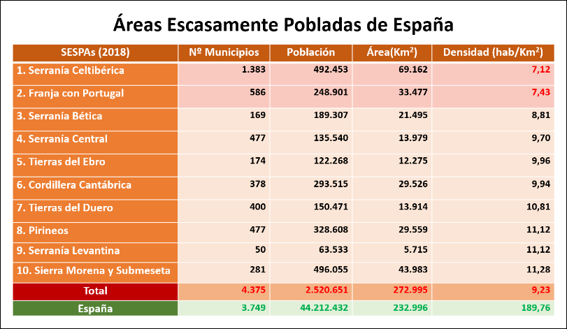 La RDEN-SESPA, formada por el Instituto de Investigación y Desarrollo Rural Serranía Celtibérica, el Instituto de Ingeniería de España y más de 15 instituciones y asociaciones ya ha realizado este minucioso estudio, además clasificando los municipios en cuestión en diversas agrupaciones o NUTS “no administrativas”. Destacan en España dos áreas en situación crítica, siendo estas la Franja Céltica y la Serranía Celtibérica (que abarca algo más que solo Cuenca, Teruel y Soria). Estas dos zonas son en toda regla “desiertos demográficos” (menor de 10hab/km2) cuyas tendencias a medio-largo plazo no son nada esperanzadoras.
