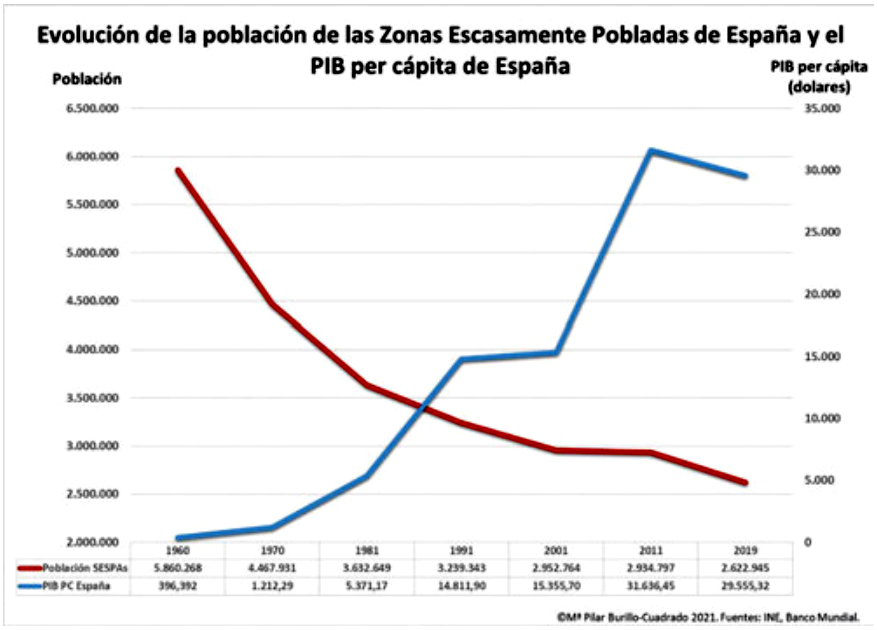 En conclusión, vemos como el problema se reduce al error en la medida o escala: las capitales de provincia distorsionan la realidad y obtenemos una visión miope de la realidad socio-económica y territorial de nuestro país. En consecuencia, los Fondo Europeos benefician a menos territorios de los que realmente podrían beneficiarse, generando así una deuda histórica de inversiones en dichas zonas. Y por ello creo que es conveniente concluir con el siguiente gráfico que muestra el crecimiento del PIB per cápita español en comparación con la población de las SESPAs españolas que no ha hecho más que reducir.