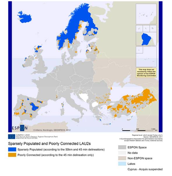 ESPON, acrónimo de European Observation Network for Territorial Development and Cohesion (Red de Observatorio Europeo de Cohesión y Desarrollo Territorial), impulsa el primer estudio sobre las “Áreas Escasamente Pobladas” (Sparsey Populated Areas, SPAs), que será realizado en 2012 por A. Dubois y J. Roto con el significativo título “Making the best of Europe´s Sparsely Populated Areas. On making geographic specificity a driver for territorial development in Europe”. Dado que las provincias no reflejan la realidad de la despoblación de Europa proponen utilizar como unidad de análisis las “Unidades Administrativas Locales” o municipios LAUs (Local Administrative Units) (UAL). Emplean el método de accesibilidad, de modo que consideran territorios despoblados los que quedan delimitados por las distancias de más de 45 minutos o 50 kilómetros desde los núcleos de más de 50.000 habitantes.