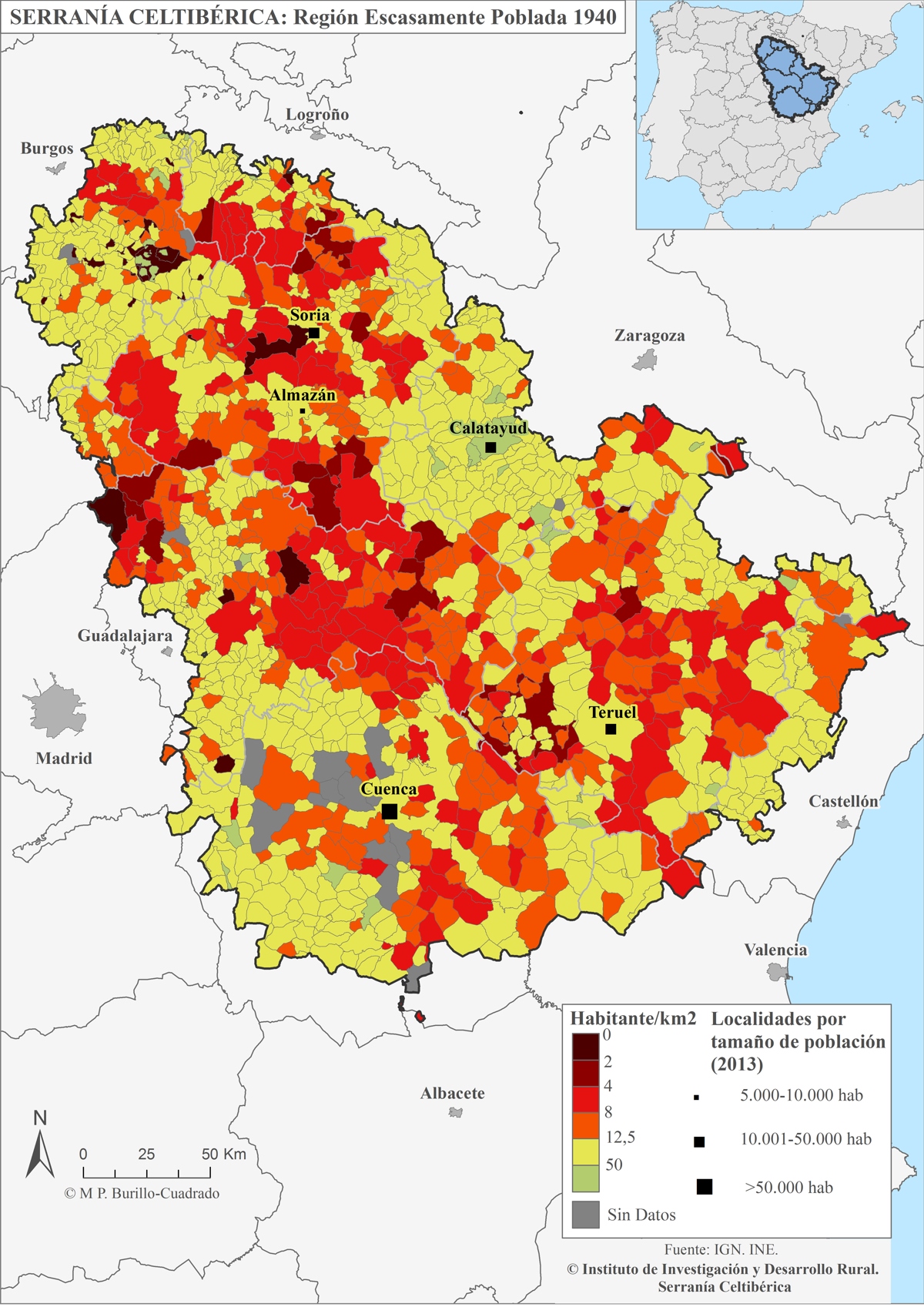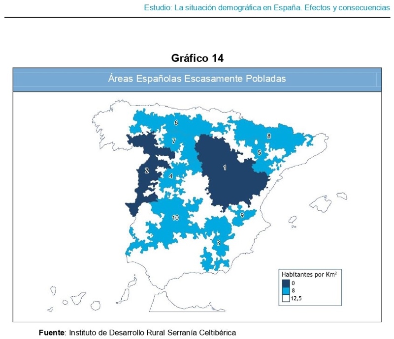 En lo que respecta a las “Áreas Rurales” la experta en GIS y análisis demográficos, Pilar Burillo de la Asociación “Instituto de Investigación y Desarrollo Rural Serranía Celtibérica”, ha delimitado las que presentan una densidad por debajo de 12,5 y 8 hab/km2. Su mapa recoge las 10 “Áreas Escasamente Pobladas del Sur de Europa”o SESPAs (Southern Europe Sparsely Populated Areas).