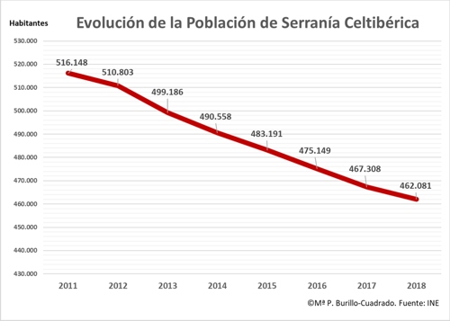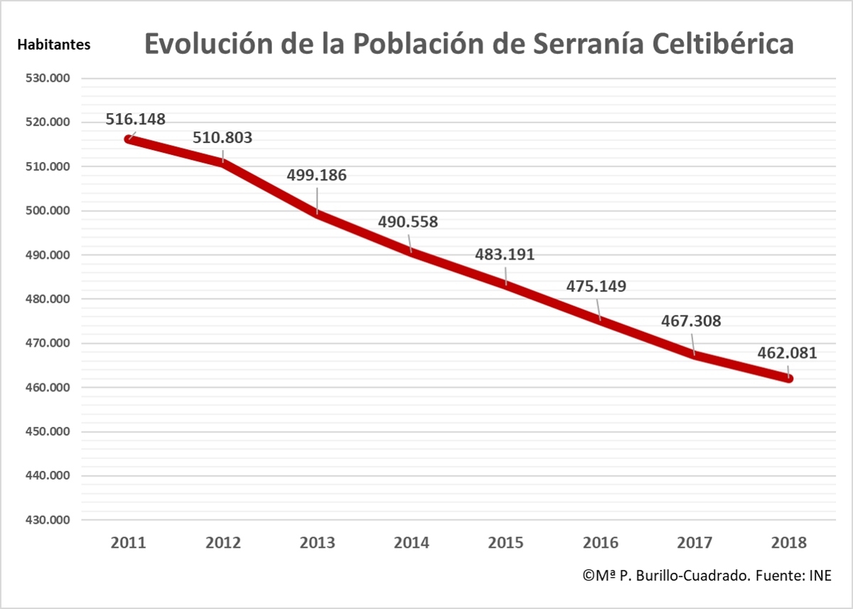 1-. ¿Qué es la Serranía Celtibérica?. Serranía Celtibérica es una interregión que se extiende por las comunidades autónomas de Aragón, Castilla y León, Castilla - La Mancha, Generalitat Valenciana y la Rioja. Agrupa 1.311 municipios. Tiene una extensión de 65.825 km2, esto es más del doble que Cataluña o Bélgica. En 1940 tenía 982.616 habitantes, con una densidad de 14,92 hab/km2, que decrece en 2.001 a 500.680 personas, con una densidad de 7,60 hab/km2, debido a un proceso constante de emigración. En 2.018 su población ha descendido a 462.081 habitantes, lo que da una densidad de 7,02 hab/km2.