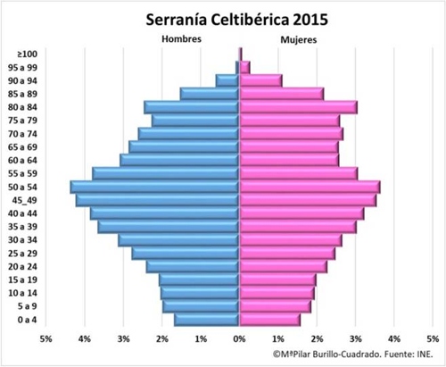 Desgraciadamente no estamos ante una foto fija. Si se observa (figura 2) la evolución de la población en estos últimos años se ve un vertiginoso descenso que en su mayor parte no se produce por defunciones, la emigración se limita a los jóvenes con talento que suelen salir fuera de España. La pirámide de edades, muestra un engrosamiento en las personas que tienen entre 50 y 54 años, en datos del 2015, debido al “baby boom”; dentro de 20 años la pirámide será totalmente invertida, con una base mínima por falta de nacimientos. Podremos dar por extinguida Serranía Celtibérica, si no conseguimos que se declare en situación de “Catástrofe Demográfica” y se aplique de forma urgente e inmediata lo estipulado en el artículo 174 del Tratado de Funcionamiento de la Unión Europea.